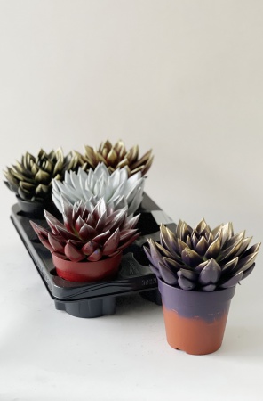 L'Echeveria est originaire du Mexique ou de l'Ouest de l'Amérique du Sud. Cette plante possède un feuillage graphique grâce à des feuilles charnues en forme de rosettes bien arrondies. Ses couleurs varient, offrant une palette allant du gris au vert en passant par le pourpre. Ce plateau propose un assortiment mixte d'Echeveria aux couleurs et formes différentes.